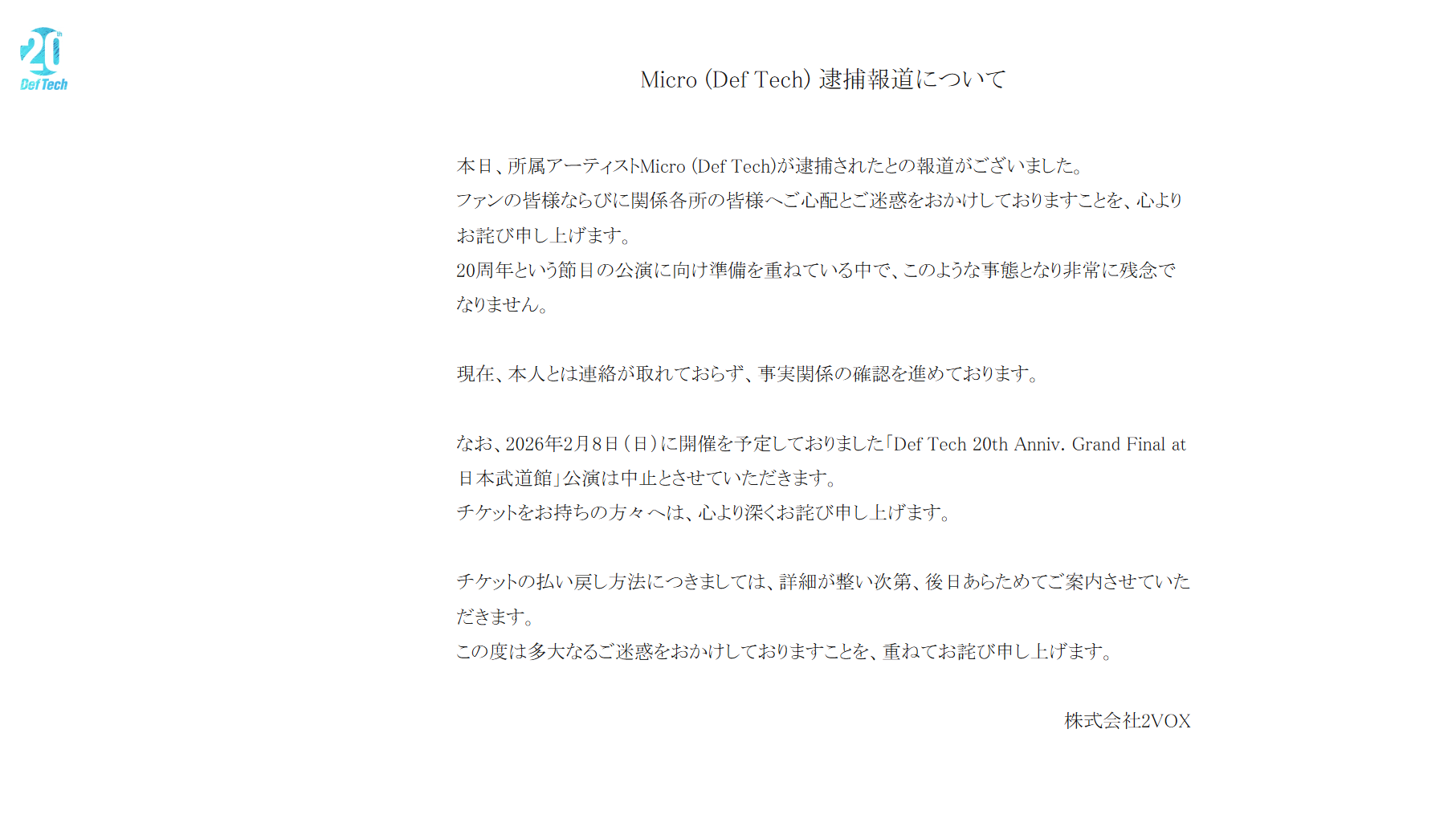 衝撃、5日前…2月8日開催の武道館記念ライブが中止に。Def TechのMicro逮捕を受けて 公式サイトで声明