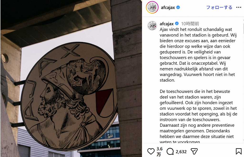 【中止までの経緯】板倉滉のアヤックス謝罪「まったく許しがたい」、発煙筒・花火大量投下で試合延期
