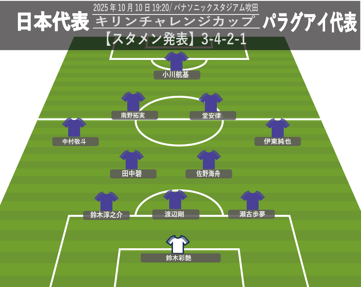 北中米ワールドカップ(W杯)まであと8か月に迫るなかでの強化試合のキリンチャレンジカップ2025、サッカー日本代表(SAMURAI BLUE)対 パラグアイ代表戦のスターティングメンバーが発表された。