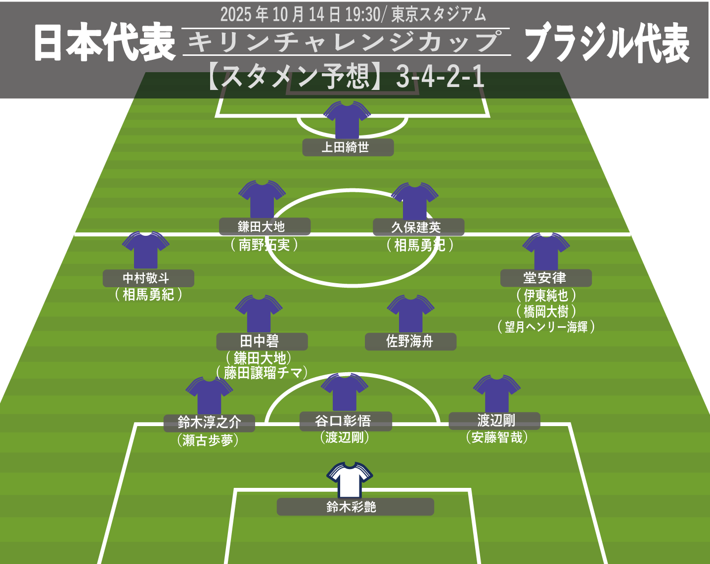 【日本代表】ブラジル戦スタメン予想。1トップに上田綺世、久保建英&鎌田大地の2シャドーが先発か