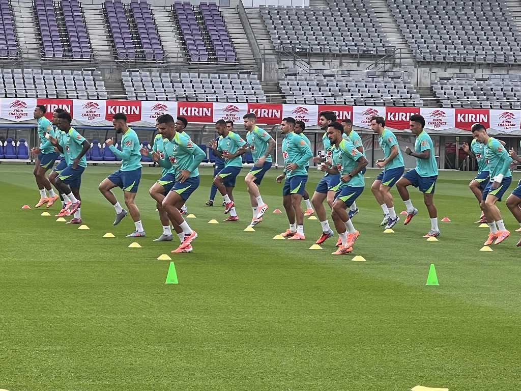 日本代表戦の前日、ウォームアップするブラジル代表の選手たち。(C)SAKANOWA
