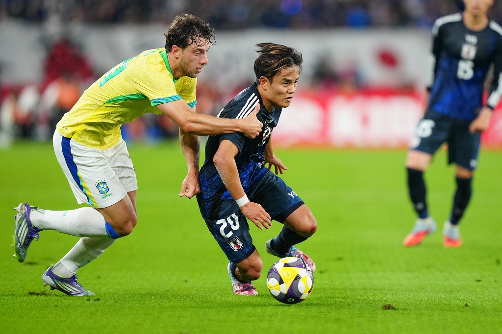 ブラジル戦で攻め込む仁保代表の久保建英。写真:早草紀子/(C)Noriko HAYAKUSA