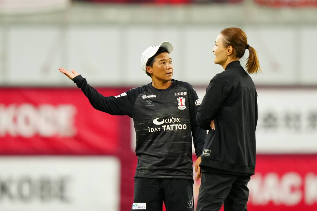 INAC神戸の宮本ともみ監督(右)と大野忍コーチ(左)。