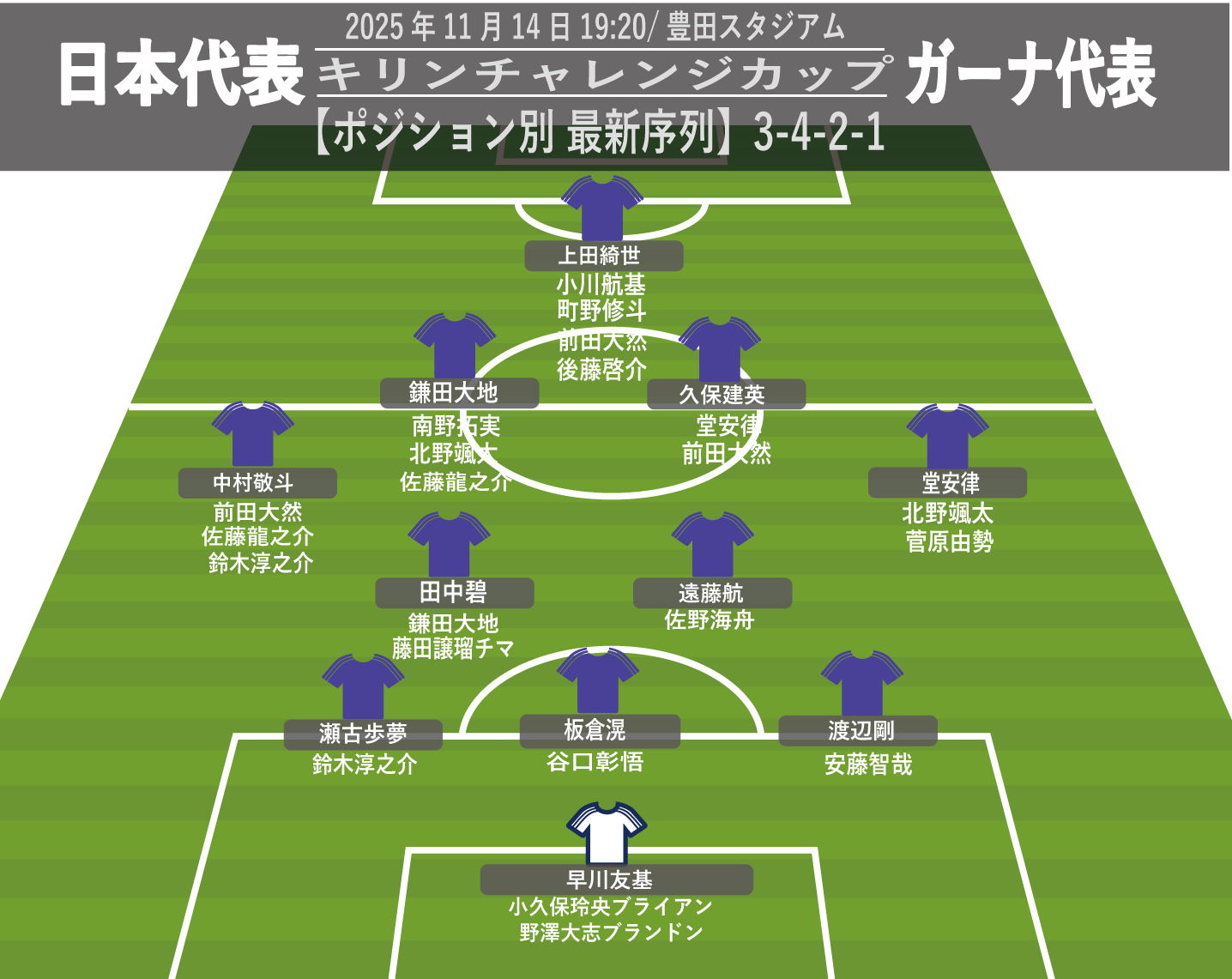 招集された26選手のポジション別の最新序列(システム3-4-2-1)をまとめ、考察したい。