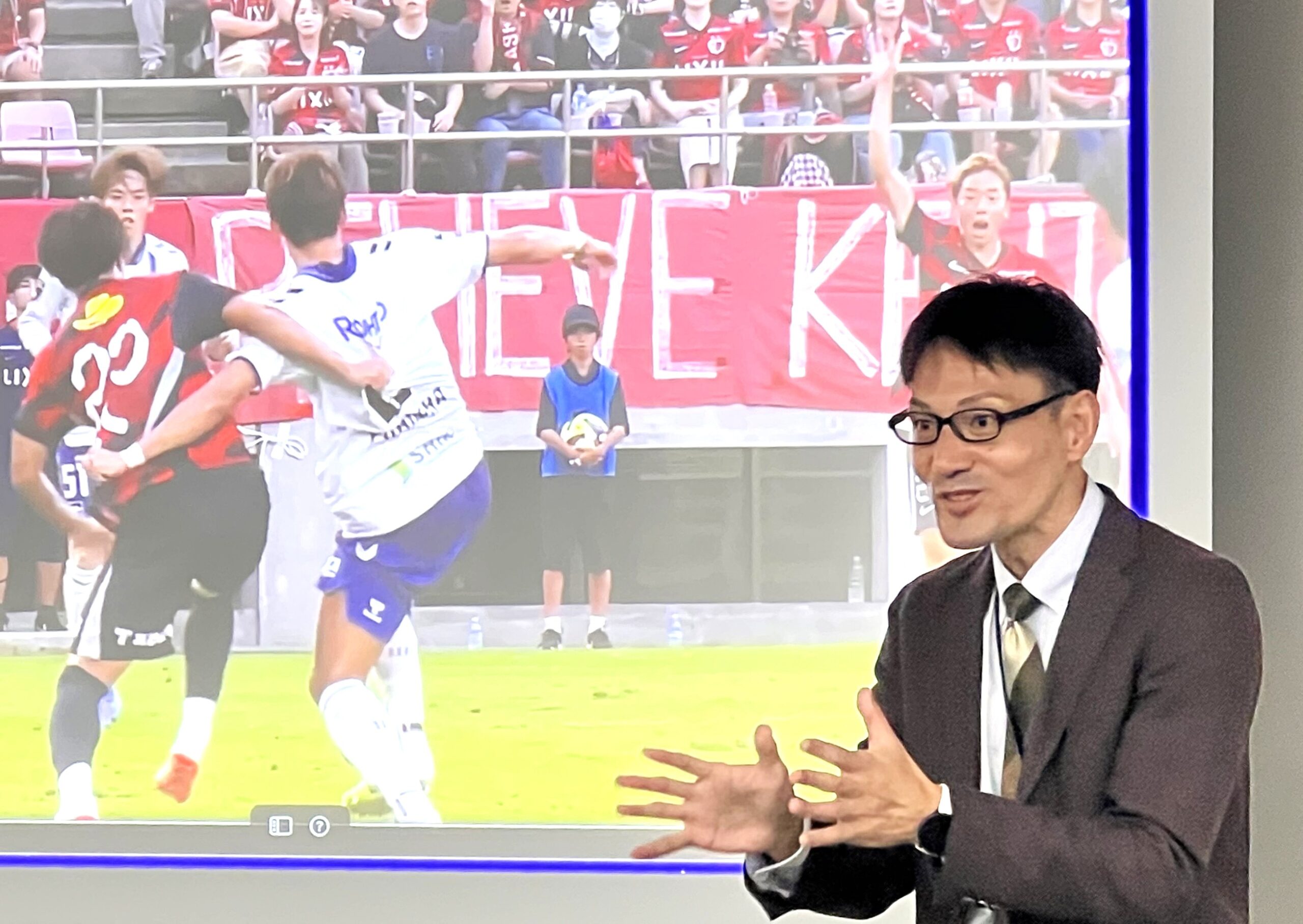 鹿島対G大阪戦でのハンドの判定について、メディアに見解を示したうえで議論をかわす佐藤隆治・JFA審判マネジャー。(C)SAKANOWA