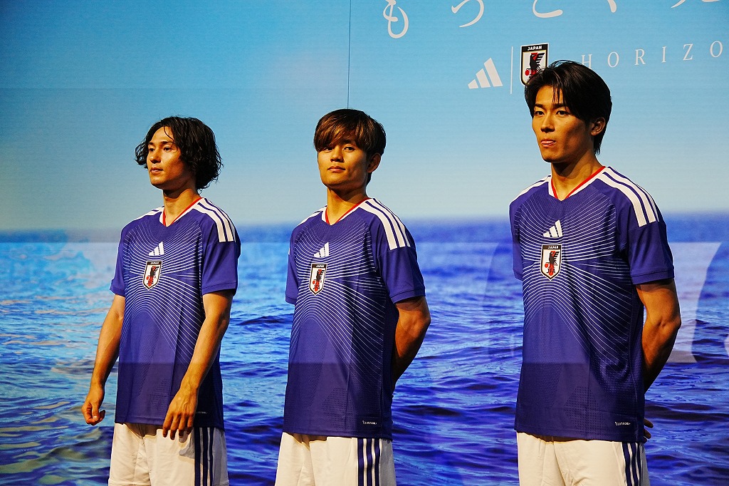 新ユニフォームを着用する日本代表の(左から)南野拓実、久保建英、中村敬斗。(C)Rintaro Asano