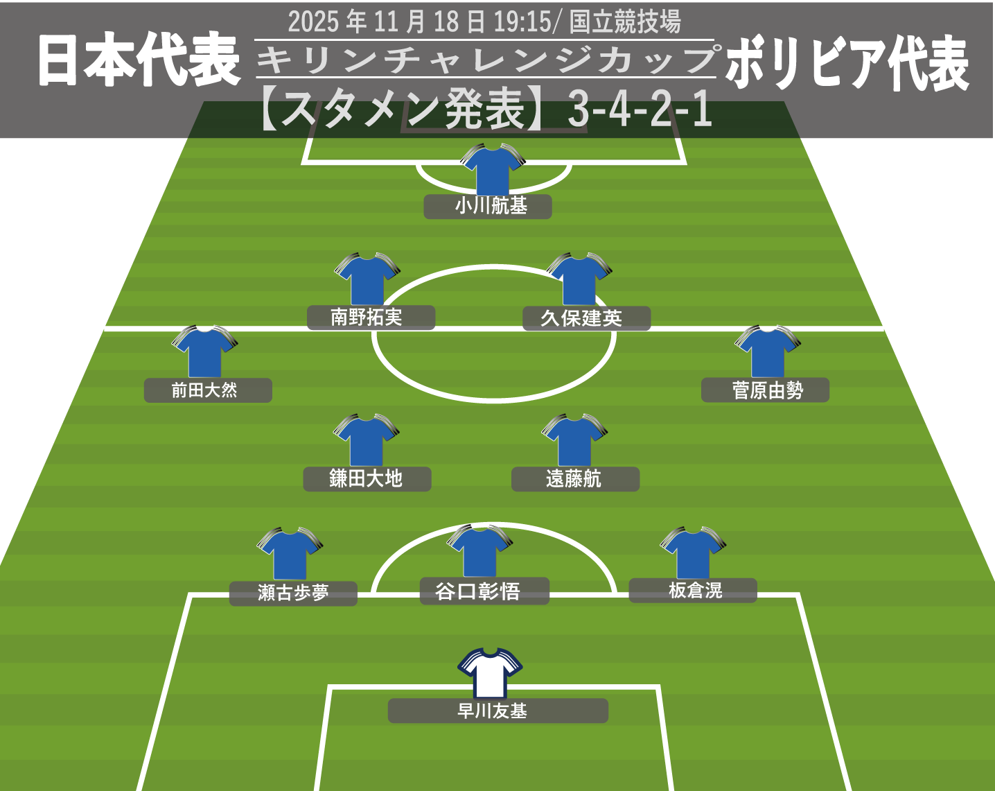 北中米ワールドカップ(W杯)まであと6か月、キリンチャレンジカップ11月シリーズ第2戦、サッカー日本代表(SAMURAI BLUE)対ボリビア代表戦のスターティングメンバーが発表された。