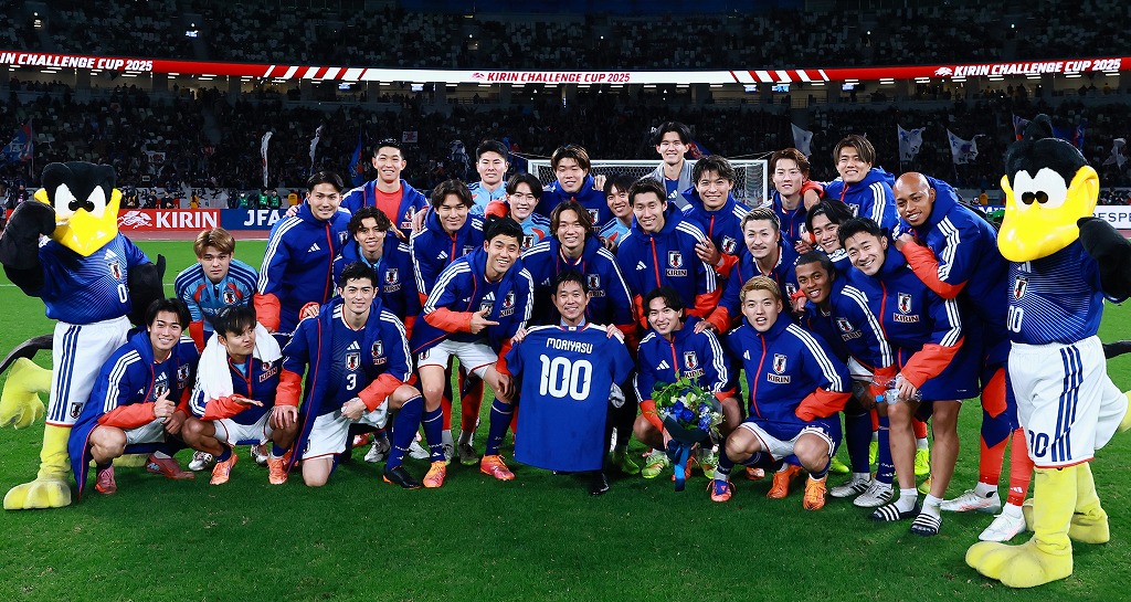 この試合が、森保一監督にとって国際Aマッチで指揮を執る通算100試合目に。歴代最多で、通算成績は69勝13分け18敗。勝率は69パーセントだ。