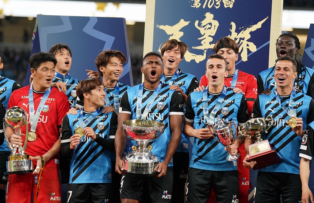 103回天皇杯を制して歓喜するジェジエウ(4番)と川崎のチームメイト。写真:早草紀子/(C)Noriko HAYAKUSA
