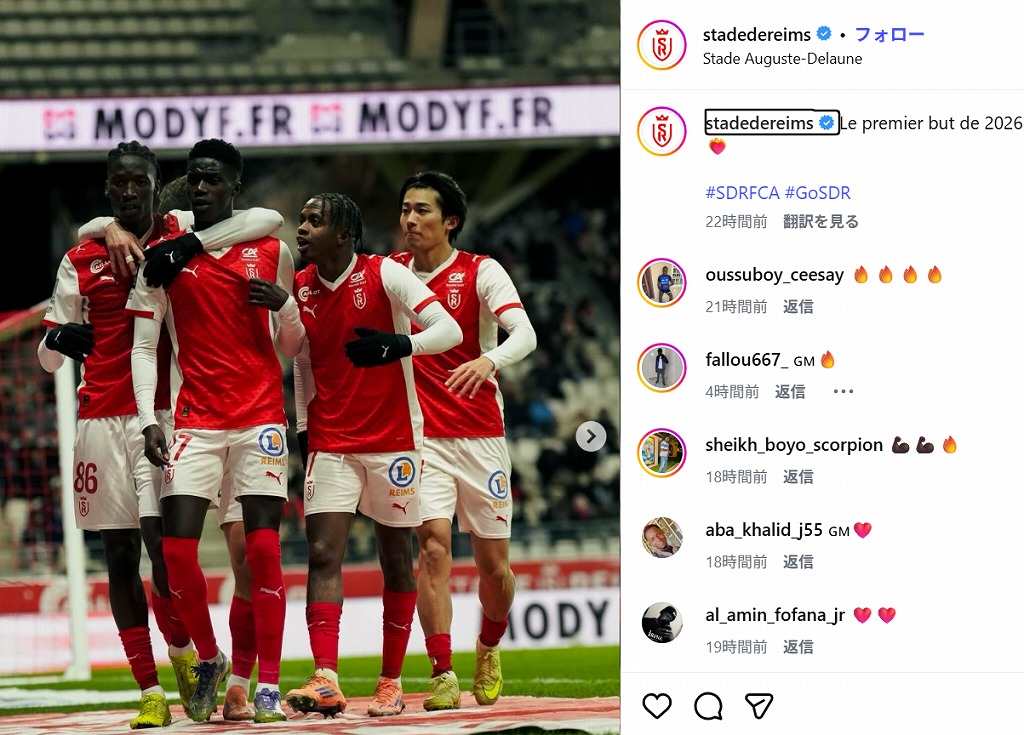 中村敬斗らスタッド・ランスの選手は胸スポンサーなしのユニフォームで戦った。 公式インスタグラムより