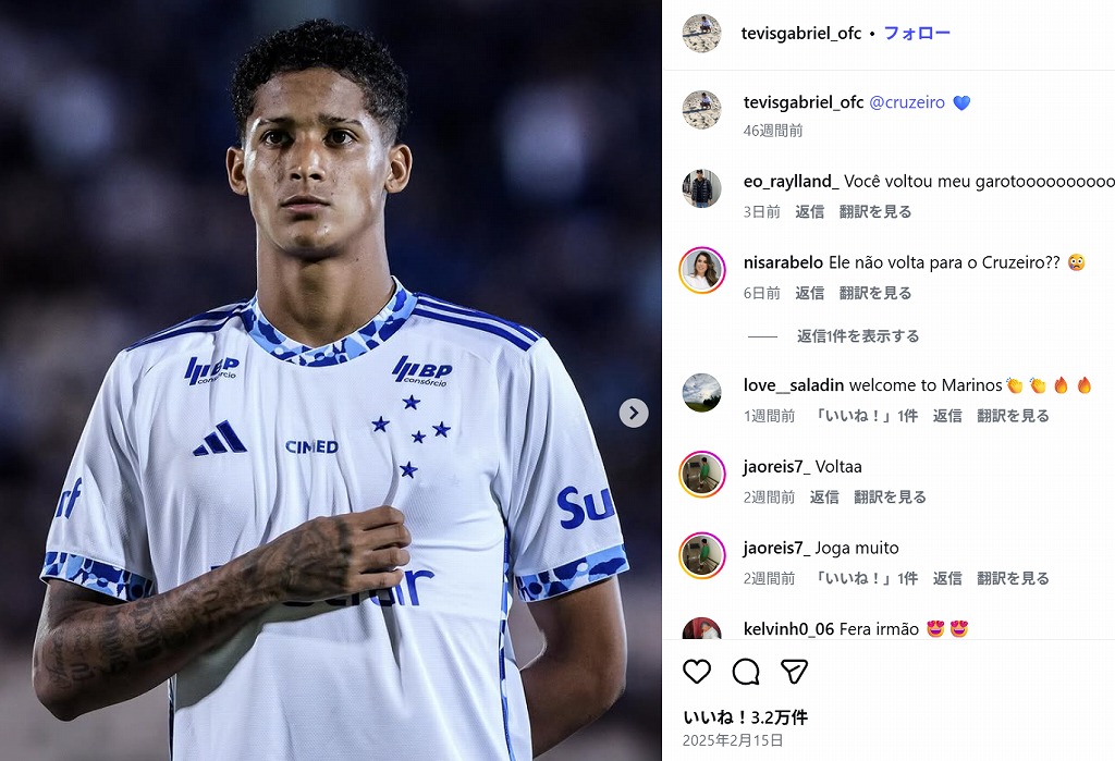 J1リーグの横浜F・マリノスは1月9日、ブラジル1部クルゼイロECに所属するFWテヴィス(Tevis Gabriel Alves Santos[TEVIS])を期限付き移籍で獲得したと発表した。レンタル期間は2026年12月31日まで。