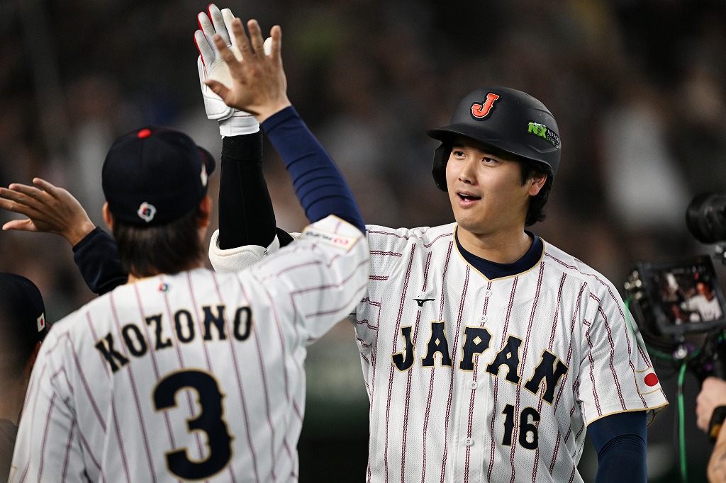 小園海斗とハイタッチする侍ジャパンの大谷翔平(右)。写真:CTK Photo/アフロ